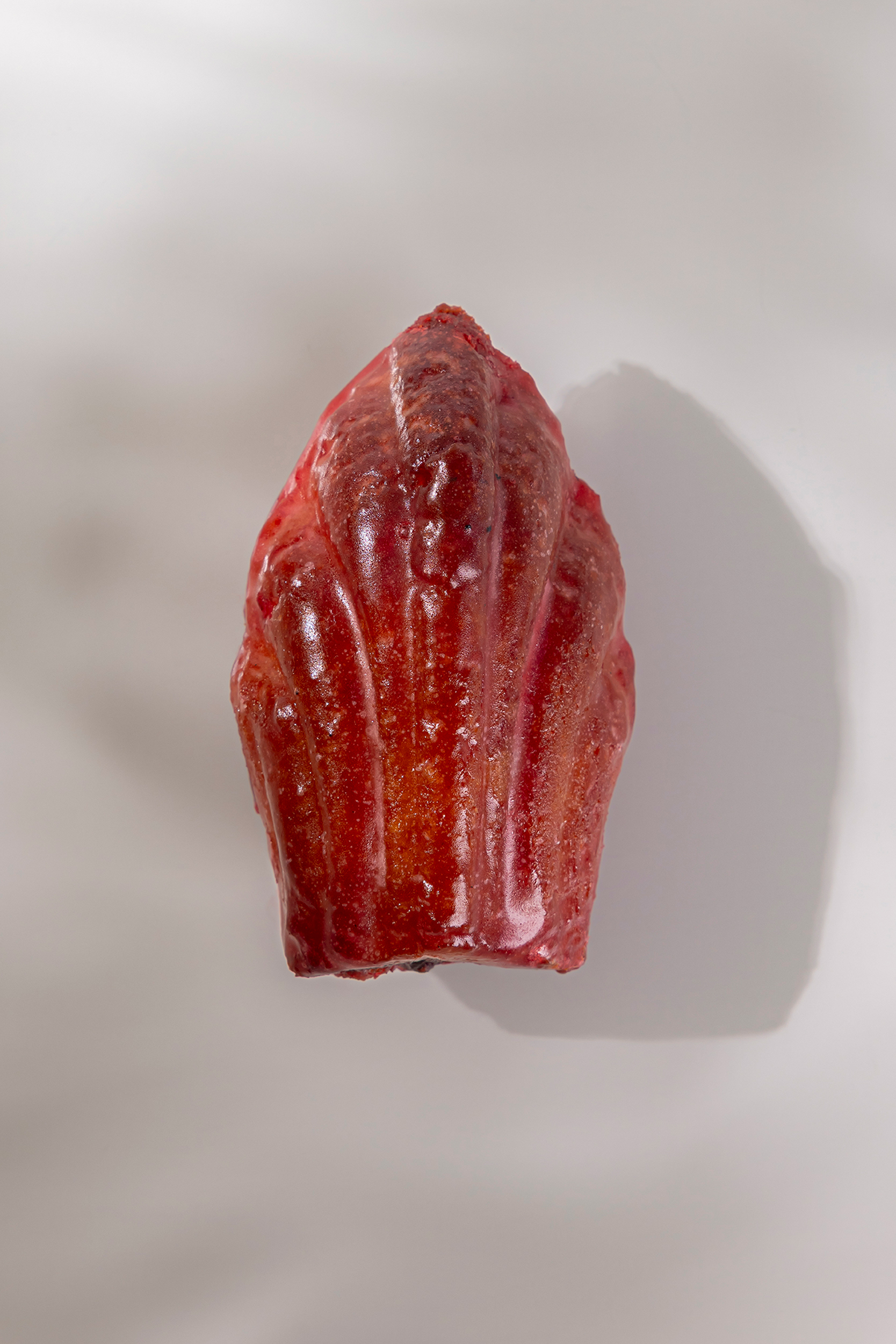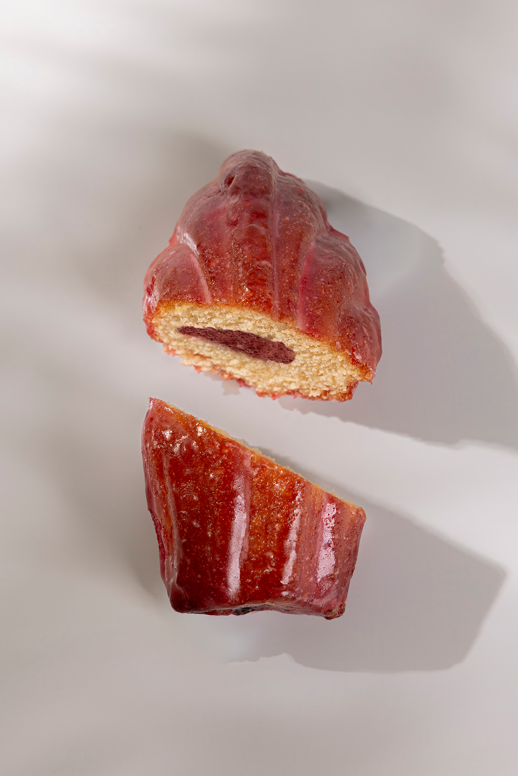 Madeleine filled with strawberry jam and coated in strawberry icing.