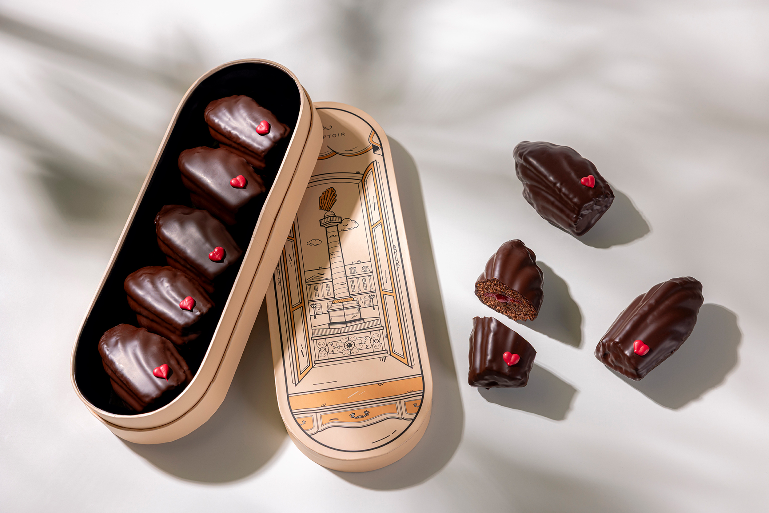 An icon of Ritz Paris Le Comptoir, François Perret’s Madeleine is reimagined in its most romantic version, bringing together raspberry and dark chocolate. A perfectly balanced, indulgent pastry pairing, delicately accented with a small red heart, the ultimate signature of a gift that is as elegant as it is generous.