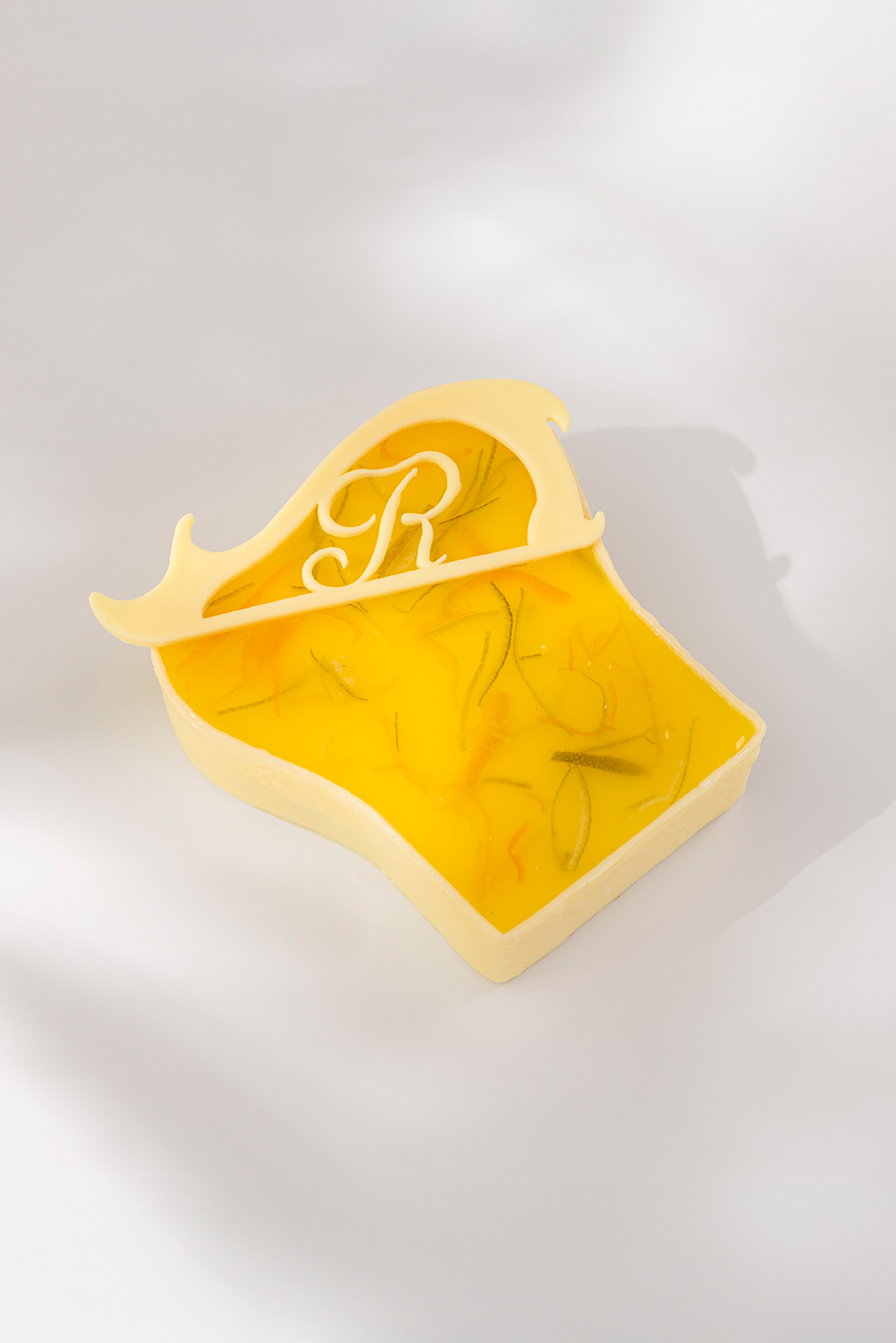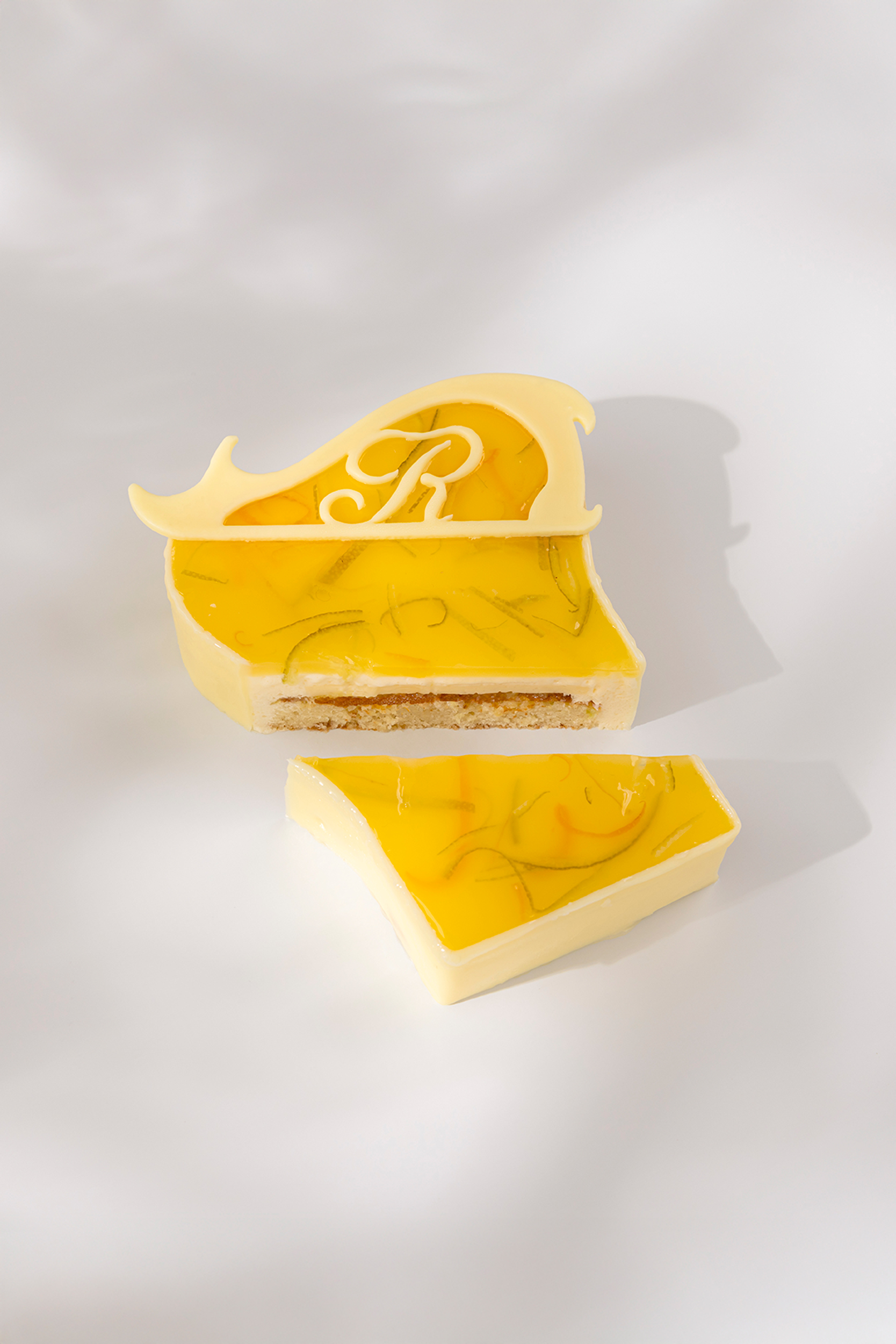 Sous un délicat décor de chocolat blanc se cache un biscuit moelleux à l’amande, nappé d’une gelée et de zestes d’agrumes confits. En son cœur, une mousse à la vanille de Madagascar enveloppe une marmelade d’orange et un crémeux citron, offrant un équilibre parfait entre douceur et vivacité.