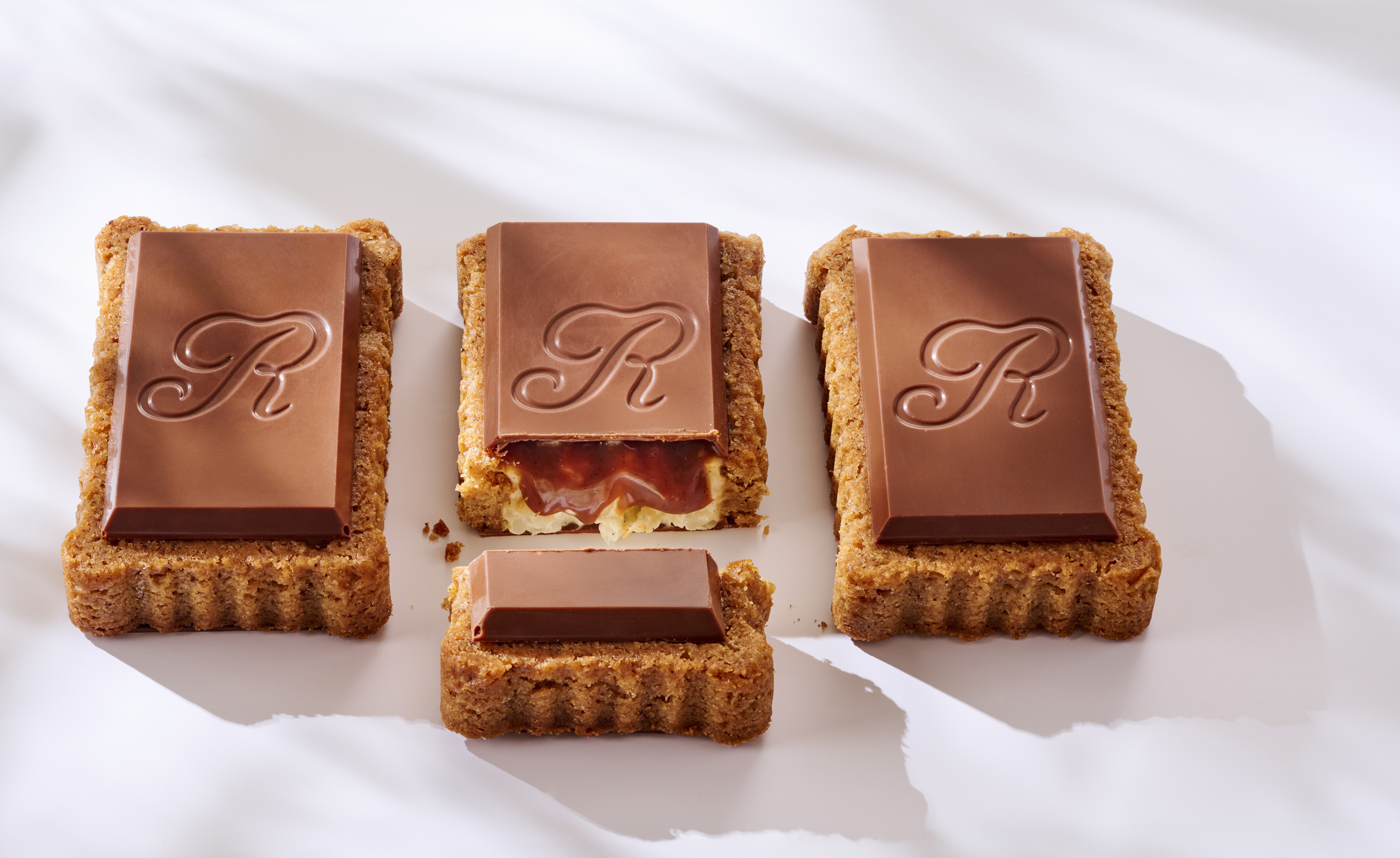 Sur une base de sablé breton aux amandes, se cache un doux riz au lait à la vanille, surmonté d'un nappage au caramel fondant et recouvert d’une couche de chocolat au lait.